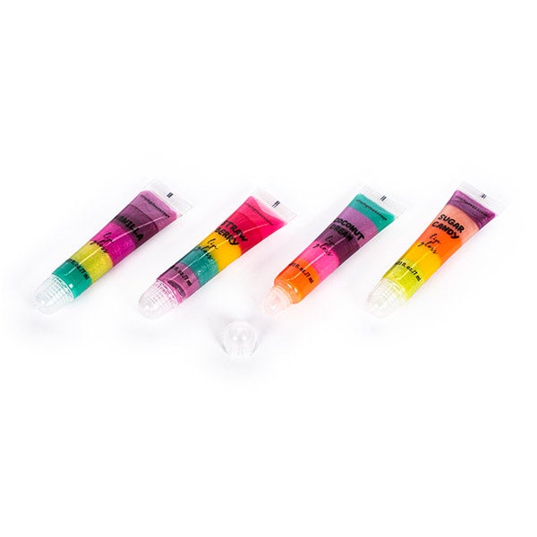 Inclui quatro lip gloss com efeito arco-íris, uma vez que se misturam os tons ficam lindos.