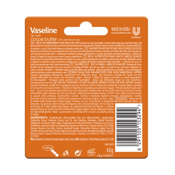 Bálsamo labial para suavizar os lábios secos dando-lhes a nutrição que precisam, com vaselina pura e rica manteiga de cacau.