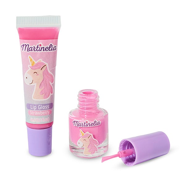 Se o seu filho(a) é fã de unicórnios, este duo composto por um brilho labial com sabor de morango e um esmalte de unhas rosa vai encantá-lo(a). Totalmente adorável!
