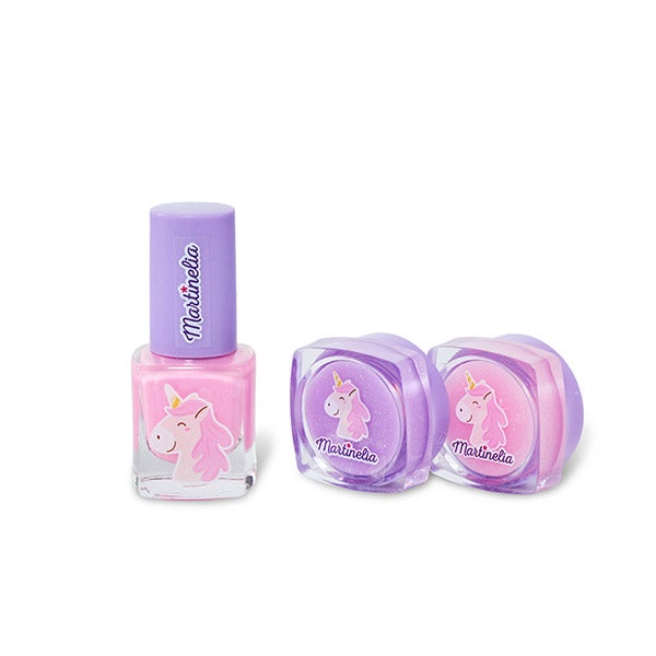 Conjunto de maquiagem que inclui um esmalte de unhas na cor rosa e dois lipgloss.