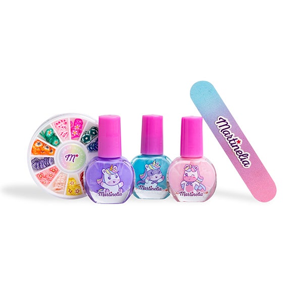 Este kit de manicure contém todos os essenciais para uma manicure perfeita em casa! Inclui três esmaltes de unhas, uma lixa e adesivos, muitos adesivos!