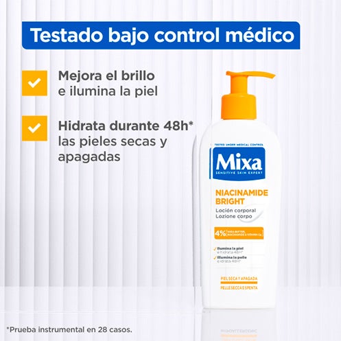 A nova Loção Corporal Mixa Niacinamida, com uma fórmula especialmente desenvolvida para peles sensíveis, contém 4% de Manteiga de Karité, Niacinamida e Vitamina C.
