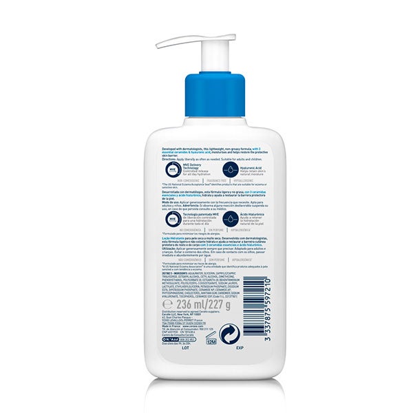 A Loção Hidratante da CeraVe hidrata de forma eficaz enquanto ajuda a reparar a barreira protetora da pele.