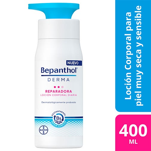 Bepanthol® Derma Loção Corporal Reparadora Diária é uma loção hidratante enriquecida de absorção rápida. Proporciona uma hidratação imediata e duradoura, até 48 h. Acalma, suaviza e oferece um extra de hidratação à pele muito seca e sensível.