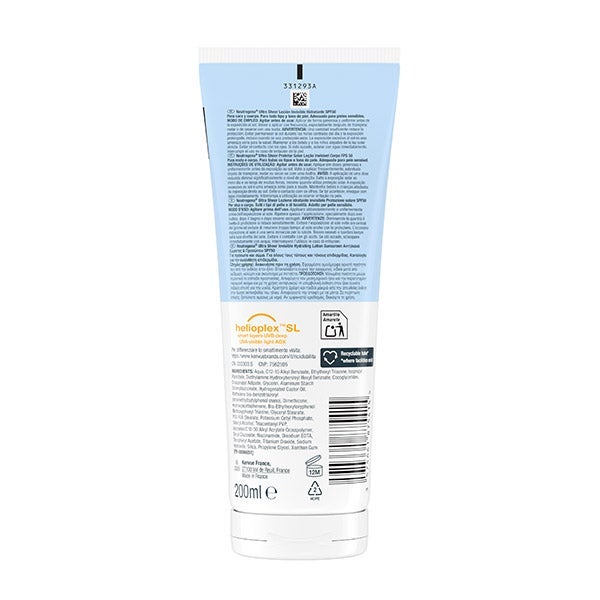 Neutrogena Ultra Sheer Loção Invisível Hidratante FPS50 (200 ml), protetor solar corporal, creme solar para o corpo resistente à água, protetor solar FPS50 ultraleve e hipoalergênico.