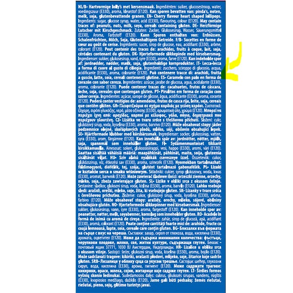 ES- Caramelo con palo en forma de corazón con sabor cereza. Ingredientes: azúcar,