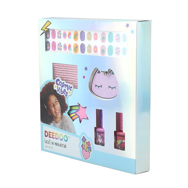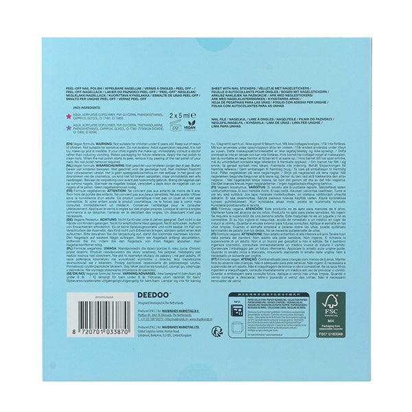 Contém dois esmaltes de unhas que se retiram sem necessidade de removedor, três folhas de adesivos para unhas, uma folha de Nail Gemstone e duas lixas de unhas com glitter e corrente metálica.