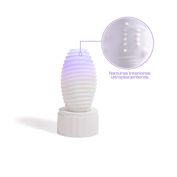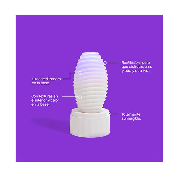 Uma vez que o brinquedo esteja quente e desinfetado, é hora de começar a desfrutar (embora também possas usá-lo diretamente sem ter que aquecê-lo). Retira-o da base e aplica um pouco de lubrificante na entrada e no interior do brinquedo ou no pênis diretamente. A seguir, introduz o teu pênis e começa a mover o masturbador de cima para baixo repetidamente para estimular o pênis através da fricção gerada pelas texturas interiores.