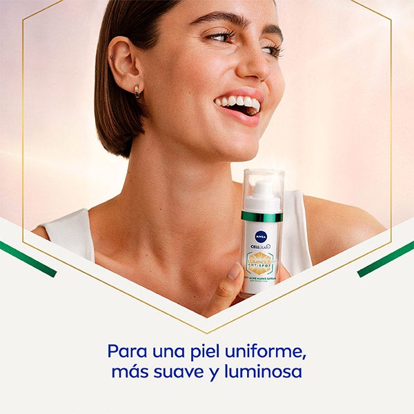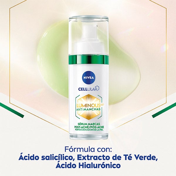 NIVEA Cellular LUMINOUS630® Sérum Marcas Pós-Acné: Este sérum leve em textura de gel exerce uma tripla ação na zona pós-acné: 1. Reduz visivelmente as marcas pós-acné, 2. Suaviza a pele e 3. Matifica a pele para um efeito controle de brilhos. Primeiros resultados visíveis em 2 semanas. Para uma pele uniforme, mais suave e luminosa.</br></br>