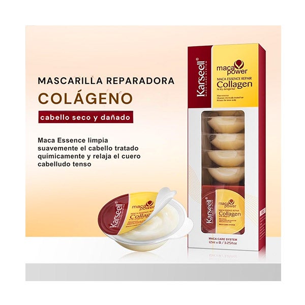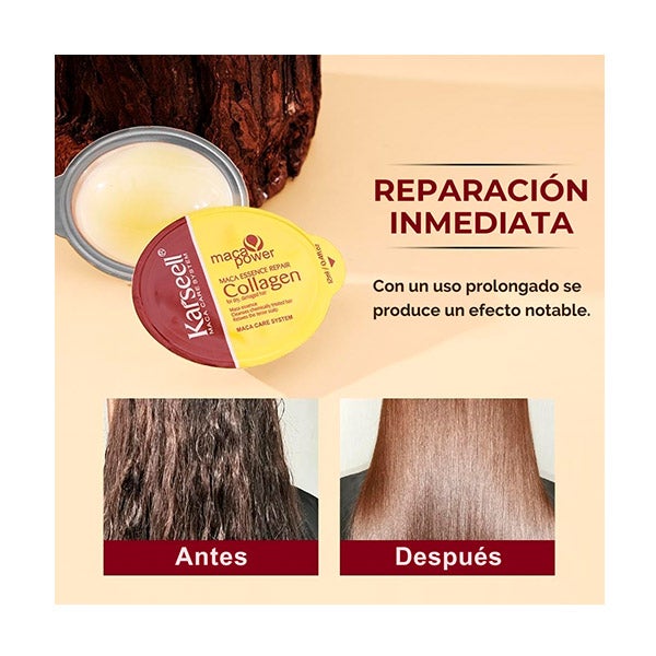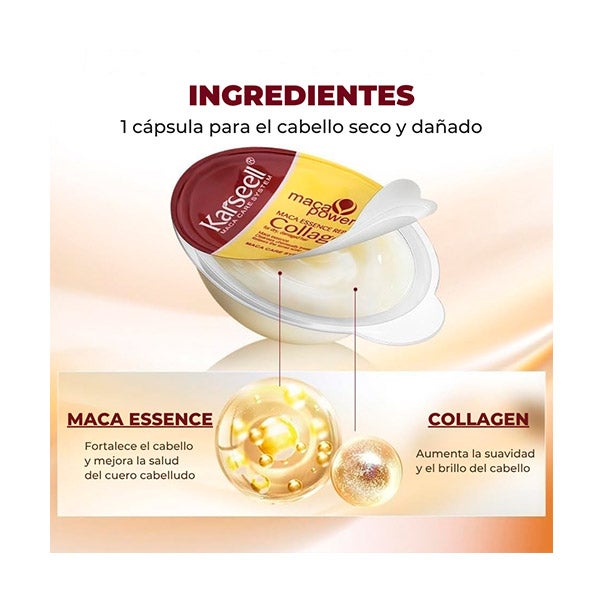 Cada cápsula contém uma dose precisa de ativos reparadores que atuam desde o primeiro minuto, penetrando na fibra capilar para revitalizá-la desde o interior. Sua fórmula avançada combina o exclusivo Maca Care System com colágeno hidrolisado, óleo de argan, manteiga de karité, óleo de abacate e proteínas vegetais, ingredientes que trabalham em sinergia para fortalecer, nutrir e selar a cutícula, deixando o cabelo extremamente macio, brilhante e cheio de vida.