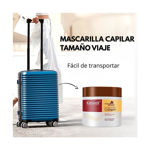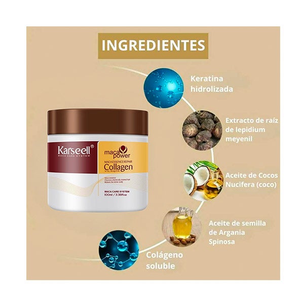 A Máscara capilar Karseell deixa o cabelo macio, brilhante e com um aroma que te transporta para um jardim de flores e frutas. Se você tem o cabelo seco e/ou danificado, não se preocupe! nossa máscara com colágeno ativo é a solução. Contém óleo de argan marroquino, muito conhecido por suas propriedades nutritivas e reparadoras, e colágeno ativo, o ingrediente estrela para uma reparação profunda, além de essência de maca e ácido hialurônico.