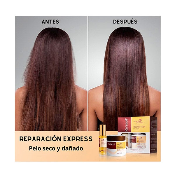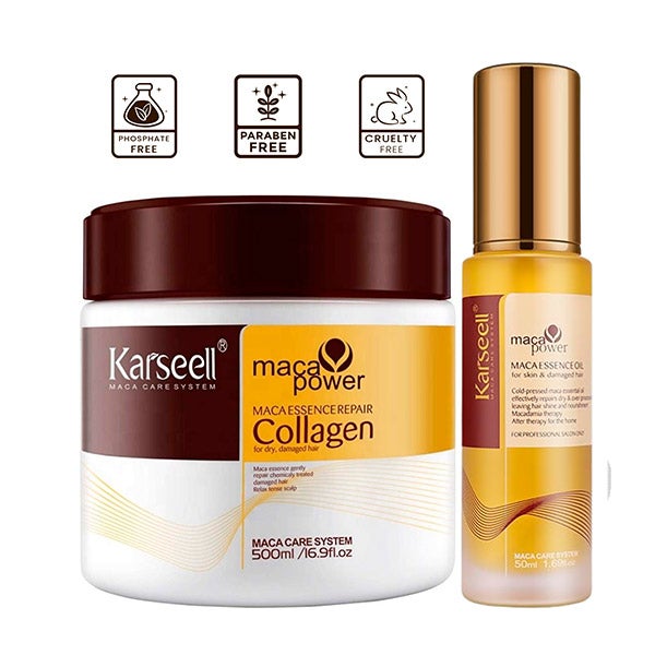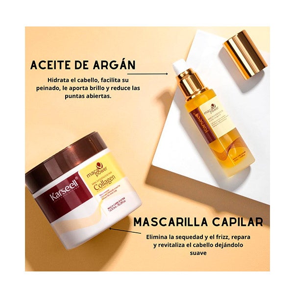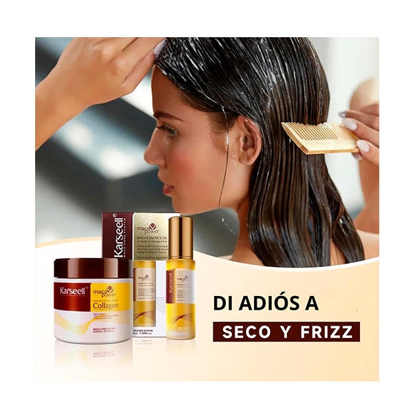 A Máscara e o Óleo capilar Karseell deixam o cabelo macio, brilhante e com um aroma que te transporta para um jardim de flores e frutas. Se você tem o cabelo seco e/ou danificado, nossa máscara com colágeno ativo é a solução. Contém óleo de argan marroquino, muito conhecido por suas propriedades nutritivas e reparadoras, e colágeno ativo, o ingrediente estrela para uma reparação profunda, além de essência de maca e ácido hialurônico.
