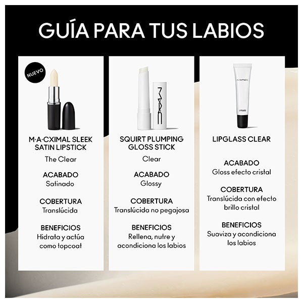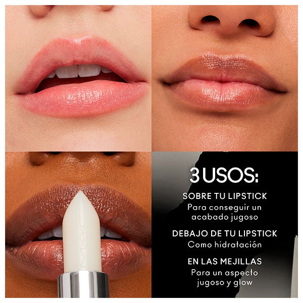 Lábios sempre In The Clear com o novo M·A·CXimal Sleek Satin Lipstick. Um bálsamo que, graças ao seu acabamento transparente e extra hidratante, pode ser usado sozinho, como preparador de lábios, sobre o seu batom favorito ou como iluminador.