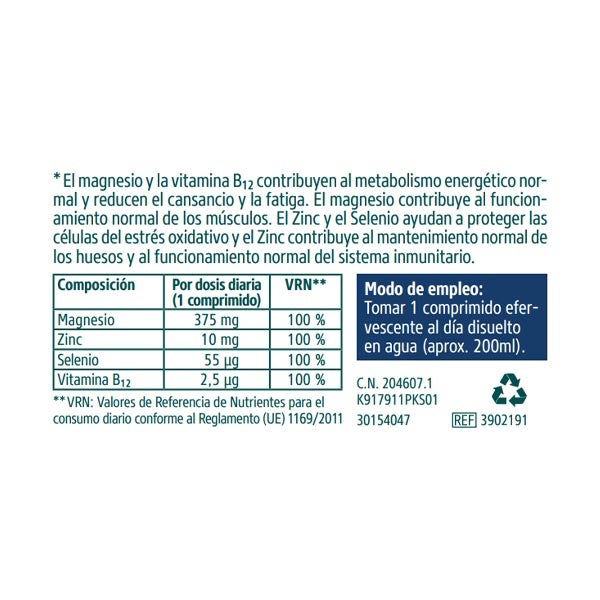 Complemento alimenticio. No sobrepasar la dosis diaria expresamente recomendada. Los complementos alimenticios no deben utilizarse como sustitutos de una dieta variada y equilibrada y de un modo de vida sano. Los preparados a base de magnesio pueden tener un efecto laxante en personas sensibles. Mantener fuera del alcance de losniños más pequeños. Mantener debidamente cerrado y en un lugar seco.
