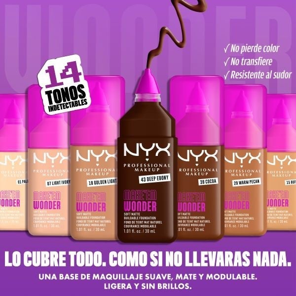 Descubra a nova base de maquiagem Make ’Em Wonder da NYX Professional Makeup, a combinação perfeita entre maquiagem e cuidado da pele. Esta fórmula líquida vegana combina cobertura modulável e acabamento mate natural para alcançar uma pele impecável sem efeito máscara.