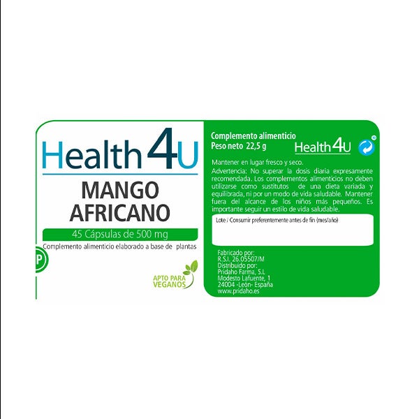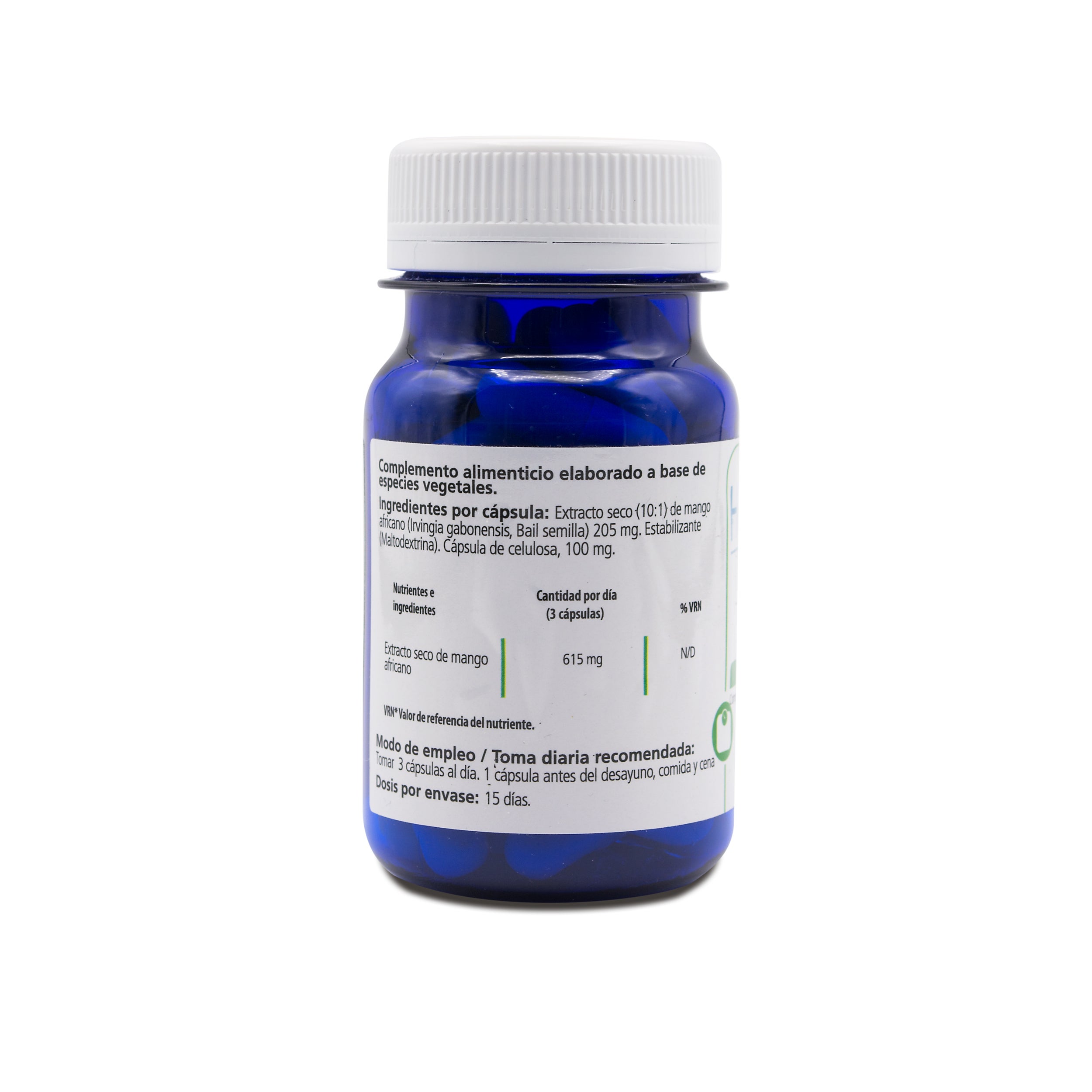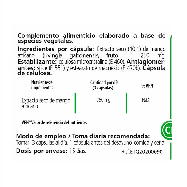 Ingredientes por cápsula: Extracto seco (10:1) de mango africano (Irvingia gabonensis, fruto) 250 mg, Estabilizante: Celulosa microcristalina (E460). Antiaglomerantes: sálice (E551) y estearato de magnesio (E470b) Cápsula de celulosa
