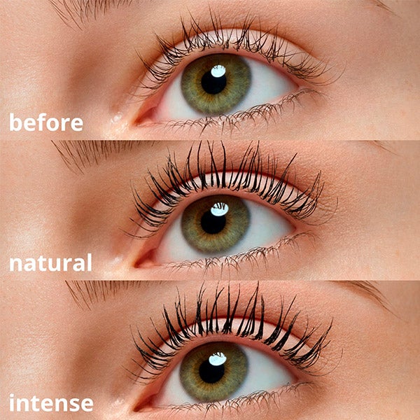 Retire o aplicador do frasco girando-o levemente e aplique a máscara nos cílios da raiz às pontas em ziguezague. Você pode aplicar várias camadas para obter resultados ainda mais intensos. Quando for a hora de removê-la, basta usar água morna, sem sujeira e sem olhos de panda.