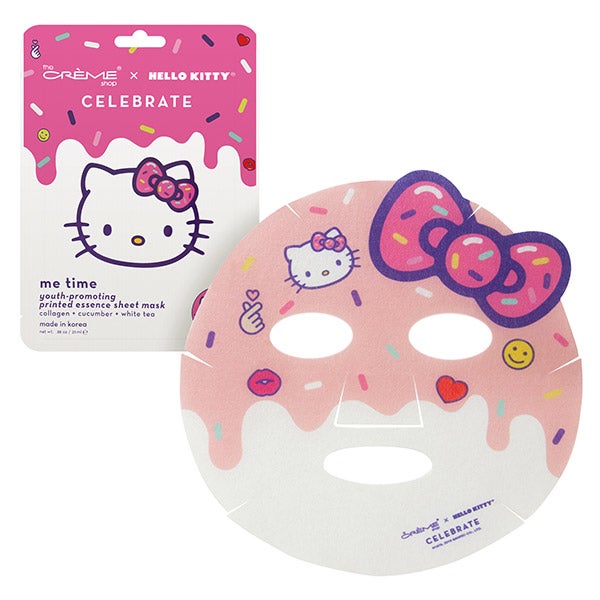 Máscara facial Hello Kitty enriquecida com colágeno, pepino e chá branco para proporcionar uma pele mais firme e brilhante.