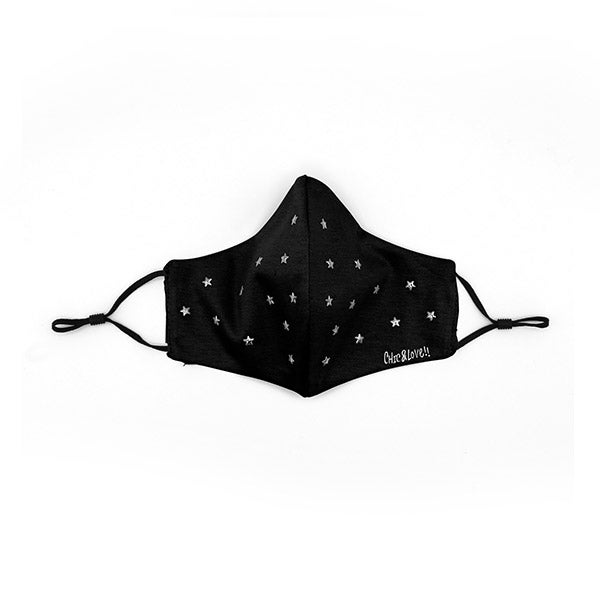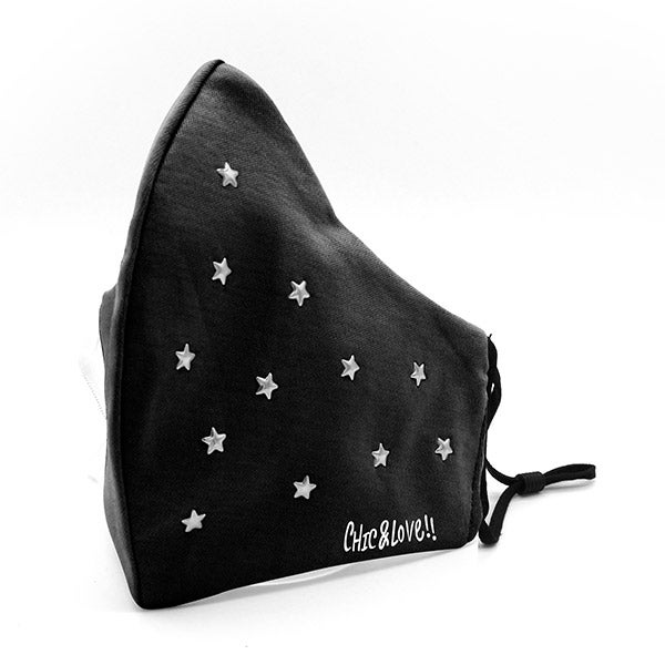 Máscara reutilizável preta para crianças da marca Chic & Love com tachinhas metálicas em forma de estrelas.
