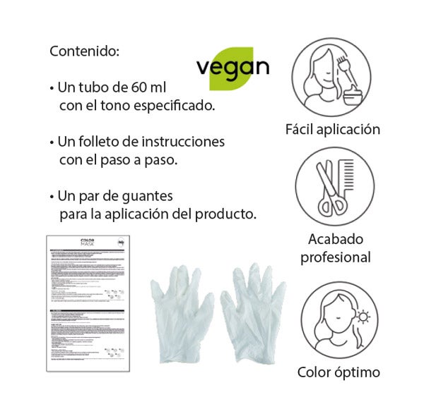 Manejo Cauteloso: en el momento de aplicación, se recomienda utilizar una toalla sobre los hombros así como los guantes incluidos en el estuche. Asimismo, hay que tener cuidado al manipular el cabello húmedo después de aplicar la mascarilla para evitar transferir el pigmento a objetos o superficies.