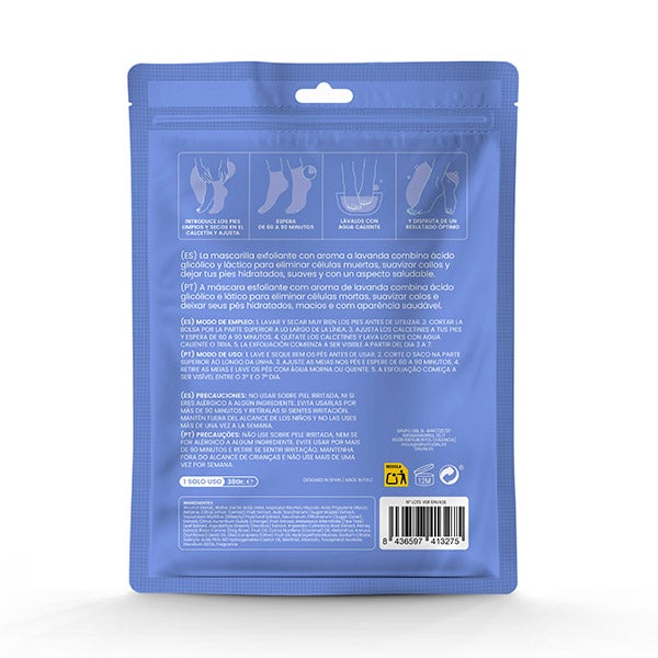 Uma experiência relaxante para os seus pés. Esta máscara esfoliante combina os benefícios calmantes da lavanda com o poder renovador do ácido glicólico e do ácido láctico, que eliminam células mortas e suavizam a pele áspera. Ideal para terminar o dia com uma sensação de spa em casa