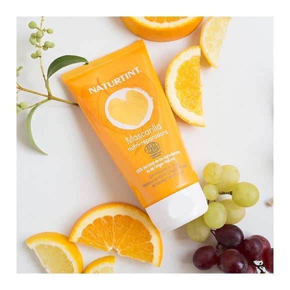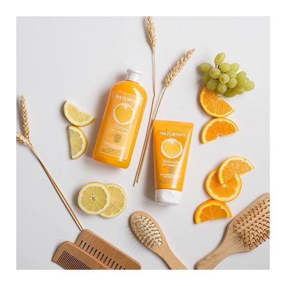 Con Hidrolizado de proteínas de Trigo, Manteca de Karité, Aguas frutales de Naranja, Limón y Uva, y Silybum Marianum.