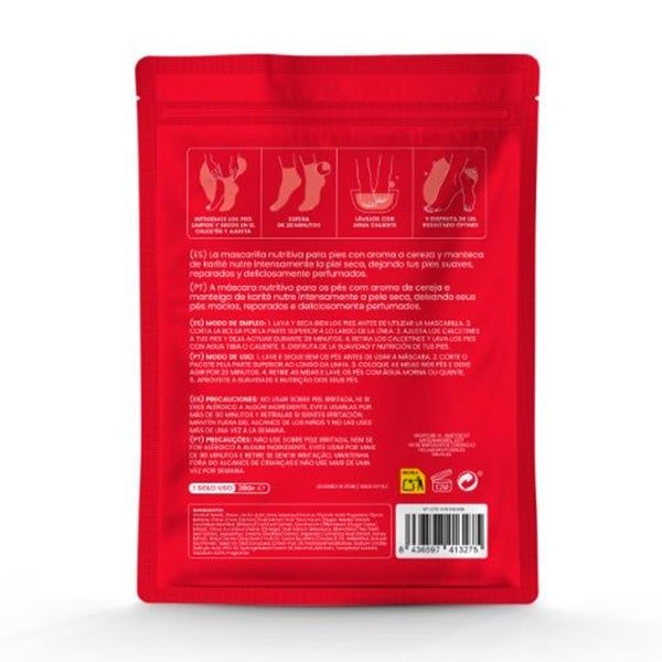 Nutrição intensa e aroma irresistível. Com manteiga de karité, esta máscara ajuda a restaurar a barreira cutânea, deixando os pés profundamente hidratados e perfumados com um toque de cereja doce. Contém vitamina para uma pele mais flexível e saudável.
