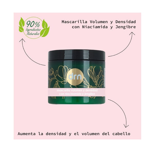 La Mascarilla Capilar Densificadora nutre y revitaliza profundamente el cabello, aportando una sensación de mayor densidad y volumen. La combinación de Niacinamida y Extracto de Jengibre penetra en la fibra capilar, fortaleciendo y restaurando el cabello desde el interior.