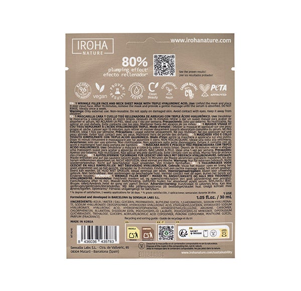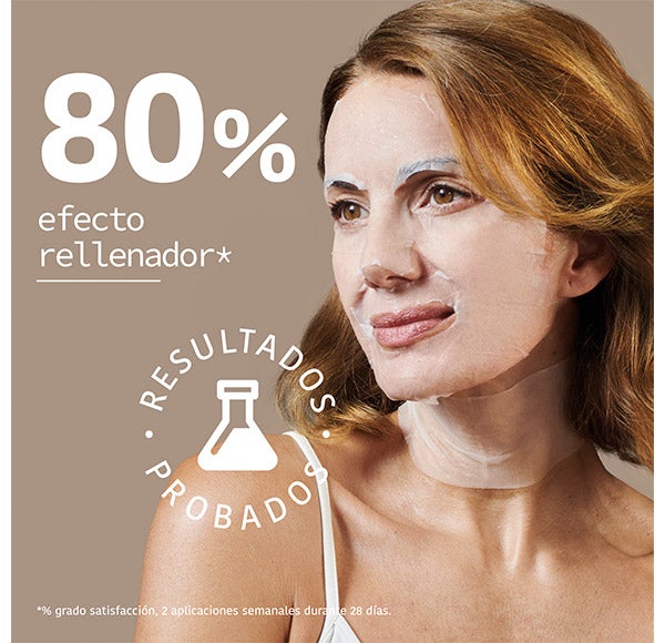 Máscara para rosto e pescoço que reduz as linhas de expressão e as rugas graças às propriedades de preenchimento e volumização.