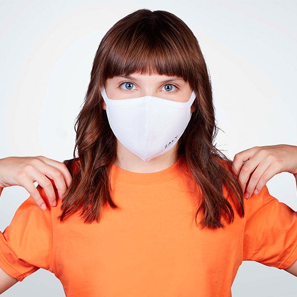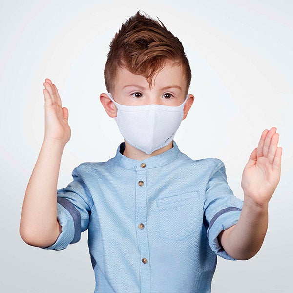 Máscara reutilizável branca disponível nos tamanhos S-M, M-L e infantil para crianças de 4-8 anos.