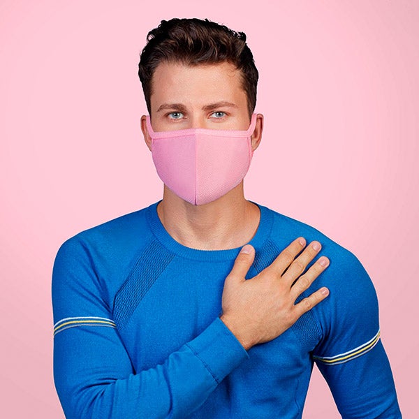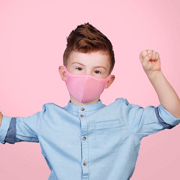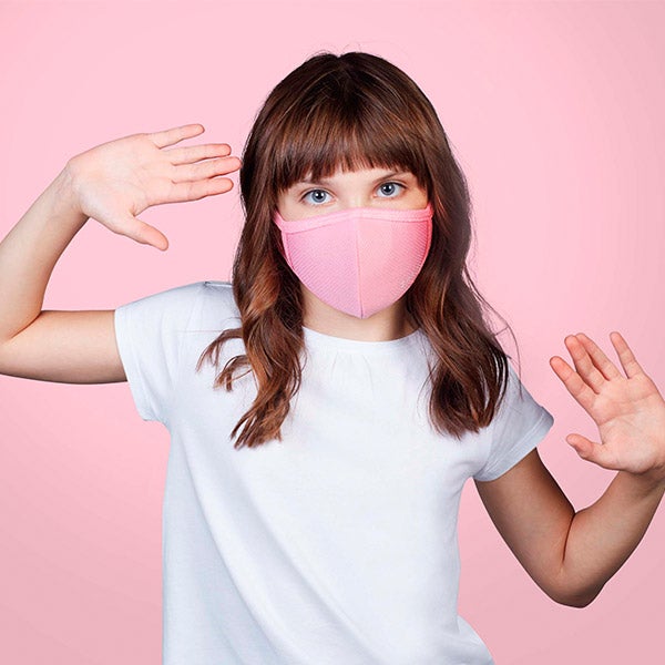 Máscara reutilizável rosa disponível nos tamanhos S-M, M-L e infantil para crianças de 4-8 anos.