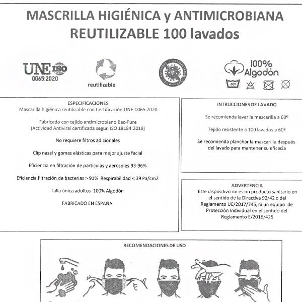 Máscara higiênica reutilizável com Certificação UNE-0065:2020.