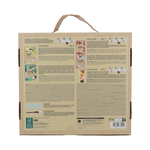 Contém uma faixa de cabelo, um pincel para máscara, duas máscaras faciais, uma máscara Peel-Off e duas máscaras de argila para purificar os teus poros e dar um plus de hidratação ao teu rosto.