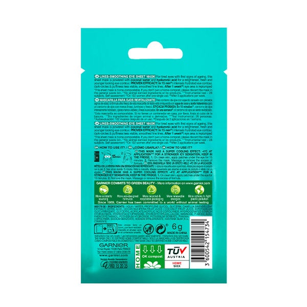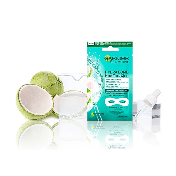 A Máscara de Tecido Revitalizante contém água de coco e ácido hialurônico e está desenhada para suavizar as linhas, anti-olheiras.