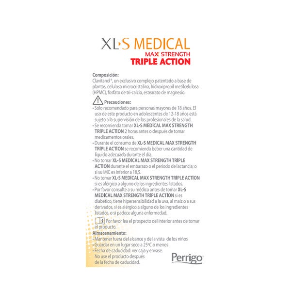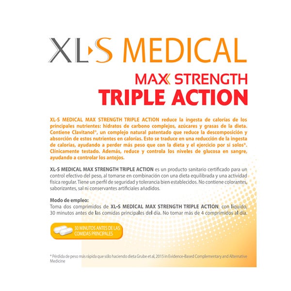 Tome dois comprimidos de XL-S MEDICAL MAX STRENGTH TRIPLE ACTION, com líquido, 30 minutos antes das principais refeições do dia. Não tomar mais de 4 comprimidos por dia.