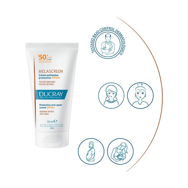 MELASCREEN Creme protetor anti-manchas SPF50+ é o primeiro creme anti-imperfeições de uso diário com uma proteção muito alta que previne e reduz a aparição de manchas marrons, ao mesmo tempo que protege a pele contra os raios UVB, os raios UVA curtos e longos, a luz azul e os efeitos nocivos da poluição.