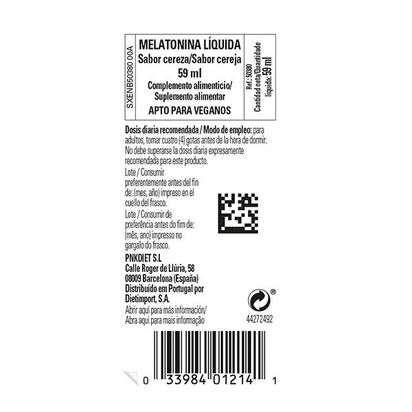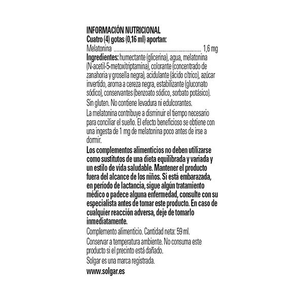 humectante (glicerina), agua, melatonina (N-acetil-5-metoxitriptamina), colorante (concentrado de zanahoria y grosella negra), acidulante (ácido cítrico), azúcar invertido, aroma a cereza negra, estabilizante (gluconato sódico), conservantes (benzoato sódico, sorbato potásico).