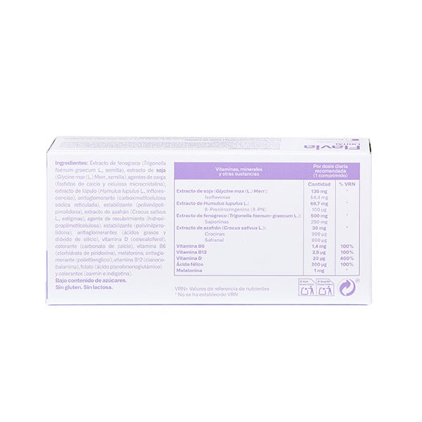 Aceite de linaza refinado (Linum usitatissimum L., semilla) (45% ácido alfa-linolénico), calcio (sal cálcica del ácido ortofosfórico), gelatina, extracto de soja (Glycine max L., semilla), humectante (sorbitol (E-420)), extracto de lúpulo (Humulus lupulus L., flor) (0,15% 8-Prenilnaringenina), humectante (glicerina (E-422)), emulgentes (cera amarilla de abeja (E-901), lecitina de soja (E-322)), espesante (monoglicéridos y diglicéridos de ácidos grasos (E-471 ), colorante (óxidos e hidróxidos de hierro (E-172)), vitamina B12 (cianocobalamina), vitamina B6 (clorhidrato de piridoxina), melatonina, vitamina D (colecalciferol) y folato (ácido pteroilmonoglutámico). Extracto de fenogreco (trigonella foenum-graecum L., semilla). Extracto de azafrán (Crocus sativus L., estigmas)