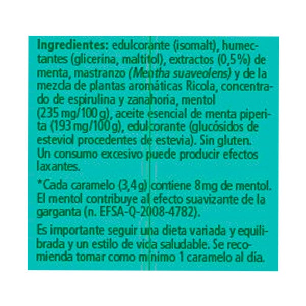 Edulcorante (isomalt), humectantes (glicerina, maltitol), extractos (0,5%) de menta, mastranzo (Mentha suaveolens) y de la mezcla de plantas aromáticas Ricola, concentrado de espirulina y zanahoria, mentol (235mg/100g), aceite esencial de menta piperita (193mg/100g), edulcorante (glucósidos de esteviol procedentes de la estevia). Sin gluten.