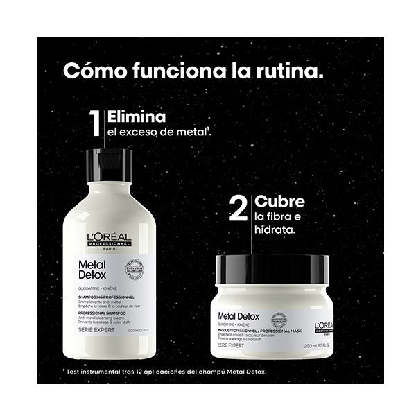 A máscara capilar Metal Detox (250ml) protege a fibra contra a deposição de novos metais, a fibra fica menos porosa e o cabelo torna-se mais brilhante e com um aspecto saudável. Atua contra a quebra do cabelo e mantém a cor. Previne a deposição de metais na fibra capilar. Deixa o cabelo revitalizado, proporcionando maciez e brilho. Previne mudanças de cor indesejadas após a descoloração, a tinta ou o balayage.