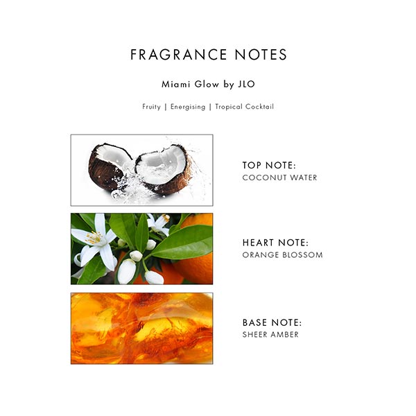 Miami Glow é uma fragrância floral frutada, sexy, quente e sensual, perfeita para as festas de verão e para abraçar o animado ambiente de Miami. Apresenta notas de saída de toranja rosa, água de coco e fruta da paixão, notas de coração com acorde de areia tostada pelo sol, flor de laranjeira e heliotrópio, e notas de fundo de âmbar puro, almíscar e baunilha. A combinação cria um aroma tropical energizante que é irresistível.