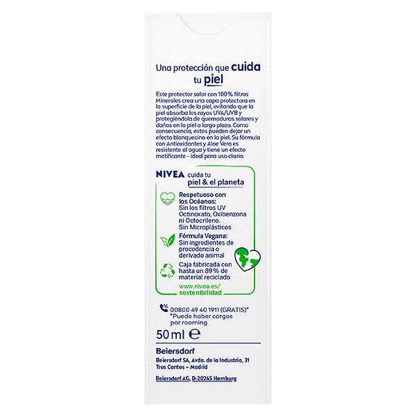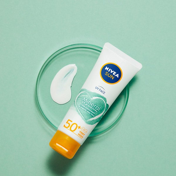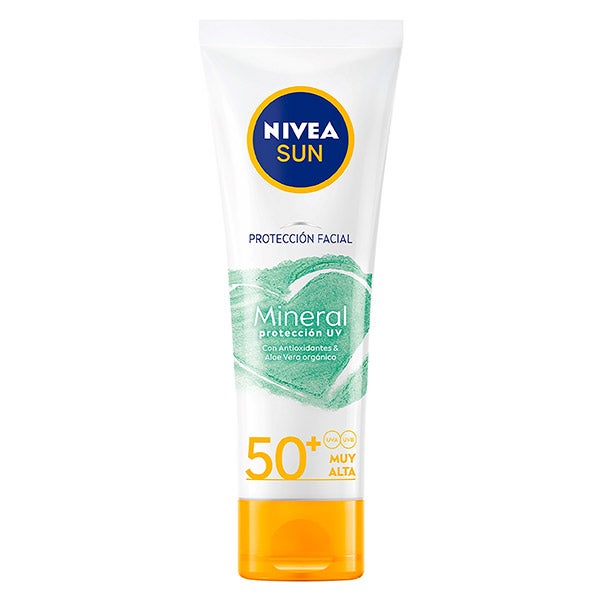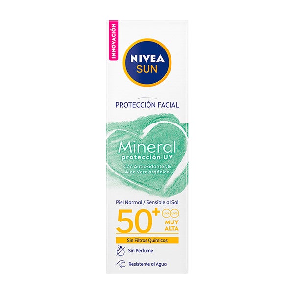 NIVEA SUN Proteção Facial UV Mineral FP50+ com 100% filtros UV Minerais que criam uma camada protetora na superfície da pele, evitando que a pele absorva os raios UVA/UVB e protegendo-a de queimaduras solares e danos na pele a longo prazo.