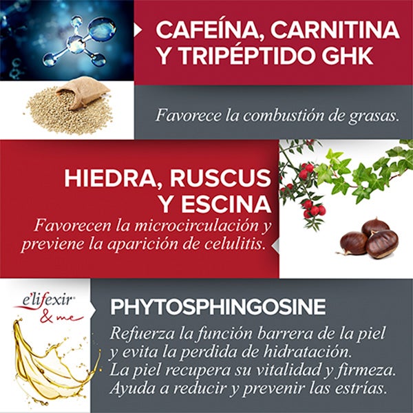 Complexo vegetal Venotônicos Pro-Lipossomado: Ajuda a melhorar a microcirculação eliminando líquidos retidos. Formulado com Ruscus e Escina: Favorecem a microcirculação graças ao seu alto conteúdo em flavonoides ao mesmo tempo que previne a aparição de celulite. Hera: com alto conteúdo em hederina que ajuda a reabsorver os líquidos retidos no tecido celulítico.