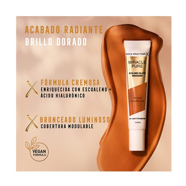 Consiga um brilho de verão com o bronzeador Max Factor Miracle Pure Golden Glow. Este inovador bronzeador cremoso e vegano é formulado com ingredientes nutritivos como esqualano e ácido hialurônico, que não apenas proporcionam uma cor luminosa e modulável, mas também cuidam da sua pele. Com o Miracle Pure Golden Glow, você pode alcançar um aspecto ensolarado e radiante durante todo o ano.