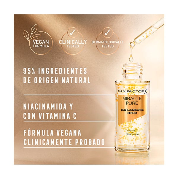 Max Factor apresenta o novo Miracle Pure Serum, um tratamento de cuidado da pele que hidrata, ilumina e revitaliza as peles opacas e secas. Sua fórmula 100% vegana contém uma alta concentração de ingredientes ativos como Vitamina C e Ácido Hialurônico que estimula a produção de colágeno. Seu uso versátil permite aplicá-lo sozinho, por baixo ou misturado com a base de maquiagem para um acabamento visivelmente mais radiante. Você não vai se arrepender!
