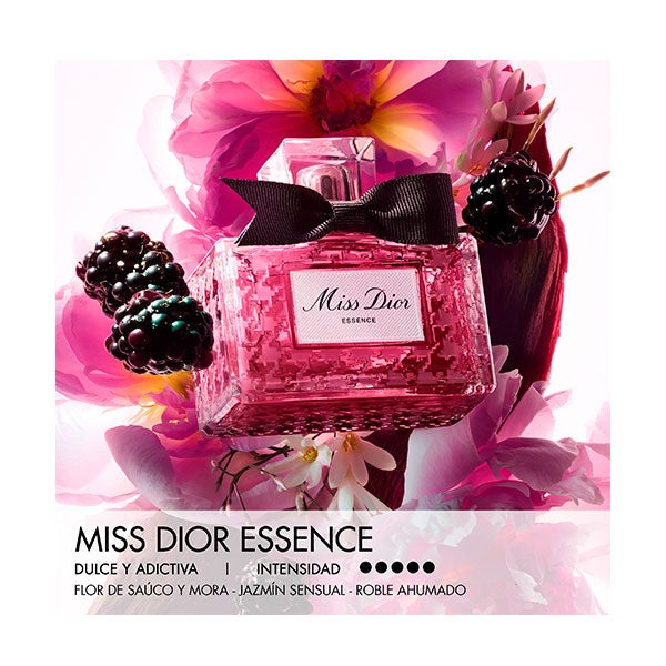 Miss Dior Essence surpreende e envolve ao mesmo tempo: o acorde de amora cristalizada e flor de sabugueiro transcende um buquê de jasmim com uma exuberância desmedida.