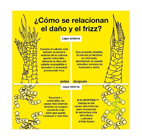 K18PEPTIDE™ combate o dano mais profundo que causa o frizz, e repara a camada mais interna da fibra capilar para reverter o dano que leva ao frizz. Na superfície, os óleos naturais (como o de abacate e girassol) junto com o hemi-esqualano e o esqualano nutrem o cabelo enquanto suavizam o frizz e os fios rebeldes para melhorar a luminosidade da cor, restaurar o brilho e proporcionar proteção contra o calor até 232°C.