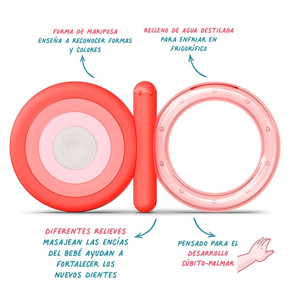 Mordedor refrigerante com forma de borboleta que ajuda o bebê a reconhecer formas e cores.