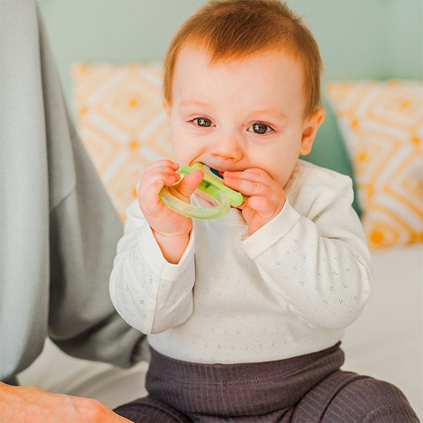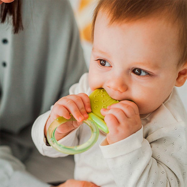 Mordedor de dentição com diferentes relevos que massageiam as gengivas do bebê e ajudam a fortalecer os primeiros dentes.