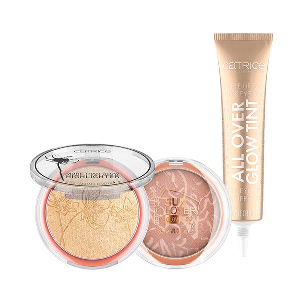Para um rosto espetacular: este conjunto com iluminador líquido, iluminador em pó e bronzer tem tudo.